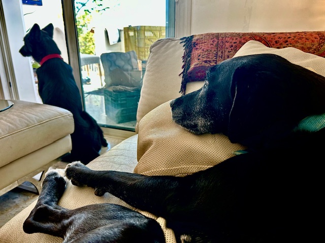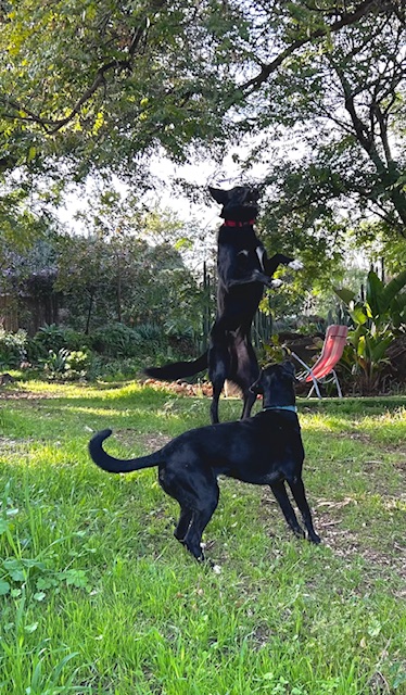 Our garden may never be Sushi proof. Bob 1/Houdini/Sushi is still finding escape routes and we are still patching up the fence. Our place looks like the “Psycho House” and weeds are thriving in the unkempt garden, but these two dogs are getting along just splendidly. Today, Sushi is content to stay at home as long as he can run, wrestle, and fetch with his new friend Bob.