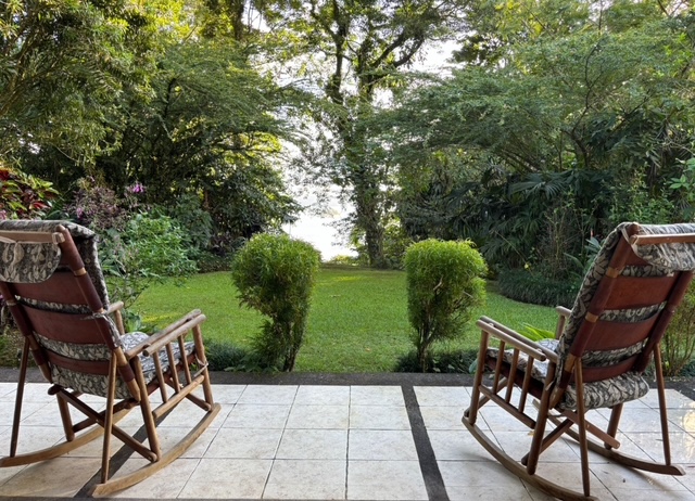 I sit outside in the morning with a coffee. I am in a rocking chair. She must have sat in this chair with her coffee mug and looked out at the garden with the beautiful lake beyond. I remember her on a winter’s morning in Toronto, coffee in one hand, crossword puzzle in the other, staring out at the bleak, white snow. And yet here, she would look out at tropical flowers, exotic toucans, and aracaris eating fruit from their bird feeders. And I think she would have been on the side of the tiny, delicate birds who are unfairly shooed away by the gorgeous greedy giants.